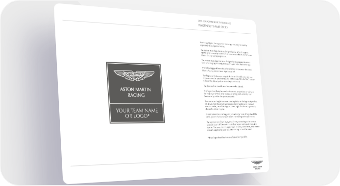 2015 CORPORATE IDENTITY GUIDELINES PARTNER TEAM LOGO The Aston Martin Racing partner team logo can only be used by appointed official partner teams. The partner team logo has been designed as the official image to represent the company’s activities as an associated team to the Aston Martin Racing works programme. The partner team logo has been designed to encompass the Aston Martin Racing logo in conjunction with your individual team logo. The following guidelines should be adhered to whenever the Aston Martin Racing partner team logo is applied: The logo as a whole is an integral device and should not under any circumstances be used without the ‘ASTON MARTIN RACING’ text or without the official partner team logo (as shown). The logo outline should never be removed or altered. The logo should only be used in its correct proportions to maintain its integrity and should be situated centrally, both vertically and horizontally, within the space provided. The minimum height to ensure clear legibility of the logo is dependant on its use, but should always remain clearly legible at its finished size. As a rule, use of the logo at 13mm high and above is generally YOUR TEAM NAME deemed suitable in print. OR LOGO* If embroidered on clothing, etc. a much larger size of logo should be used, please check a sample before committing to its application. The appearance of the logotype will vary, according to the amount of space that is left between individual letters and words when it is typeset. To ensure that its appearance is always consistent, only master artwork supplied by your account manager should be used. *Team logo should be in mono form where possible.