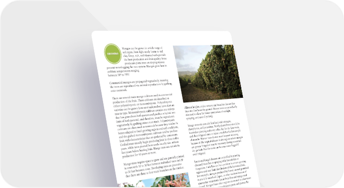 GROWING Mangos can be grown in a wide range of soil types, from light sandy loams to red clay. Deep, rich, well-drained soils provide the best production and fruit quality. Some producers plant trees on sloping sites to prevent waterlogging the root system. Mangos grow best in ambient temperatures ranging between 70º to 75ºF. Commercial mangos are propagated vegetatively, meaning the trees are reproduced via asexual reproduction by grafting onto rootstock. There are several main mango cultivars used in commercial production of the fruit. These cultivars are described as either polyembryonic or monoembryonic. Polyembryonic varieties can be grown from seed and produce trees that are true to type. Monoembryonic cultivars contain one embryo that has genes from both parents and produce a hybrid tree (mix of both parents), and therefore, must be reproduced vegetatively by grafting onto a root stock. Polyembryonic cultivars are often used as rootstock because they tend to be better adapted to local growing regions and soil conditions, and the grafted monoembryonic cultivars tend to produce fruit with characteristics that are preferred by consumers. Grafted trees usually begin producing fruit in three to five years, while trees planted from seeds usually take at least five years before bearing fruit. Mango trees can remain in production for 40 years or more. Mango trees require space to grow and are generally planted in rows with 10 to 30 feet between individual trees and 20 to 30 feet between rows. Developing trees are pruned so that there are three to four main branches on the trunk at differ ent heights, and to remove any branches that are less than two feet from the ground. Mature trees are periodically trimmed to allow for better penetration of sunlight, spraying, and ease of picking. Mango trees are annually fertilized with nitrogen, phosphorus, and potassium. Newly planted trees should be watered at planting and every other day for the first week, and then irrigated once or twice a week for the first couple of months. Mature trees do not need frequent watering because of the tropical climate in the regions where mangos are grown. Irrigation may be necessary during occasional dry periods, but the roots can become water logged if over irrigated. Insect and fungal diseases are controlled by pruning diseased branches or spraying with insecticides or fungicides. Fruit flies can be a problem in certain growing regions and may limit distribution of the harvested fruit. For example, mangos produced in Hawaii are not permitted in the U.S. mainland, Japan, or other markets because of quarantine restrictions due to fruit flies and mango seed weevil. Mangos from other regions are treated in a hot water bath following harvest to eliminate pests and protect the fruit from decay. Mango trees begin blooming in the winter months and continue through spring. Most blossoms function as males by providing pollen, but some are bisexual and are self- pollinating. Insects such as flies, wasps, and bees help accomplish pollination. Depending on the variety, the fruit may take from 100 to 150 days to mature, resulting in a late summer and fall harvest. The weight of the mature fruit may vary from one-quarter pound to two pounds and may be round or oblong depending on the variety. 3 MANGOS